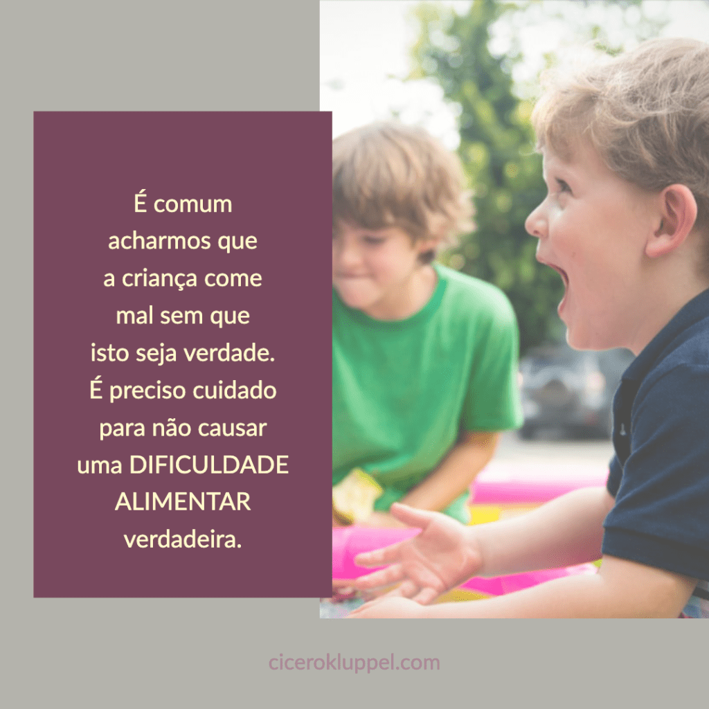 Algumas vezes estas crianças estão comendo adequadamente, com uma variedade adequada para a idade. Mas como os pais estão muito preocupados começam a tomar condutas alimentares que vão desenvolver uma dificuldade alimentar verdadeira, a criança passa a se relacionar muito mal com a comida e com o momento da refeição.